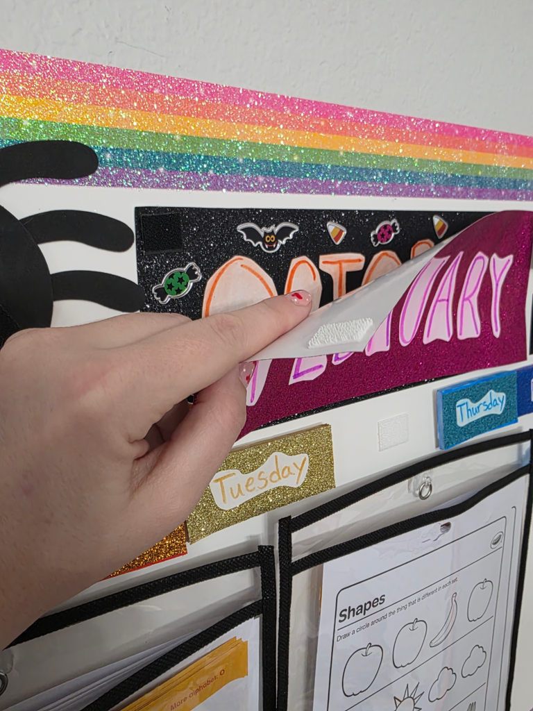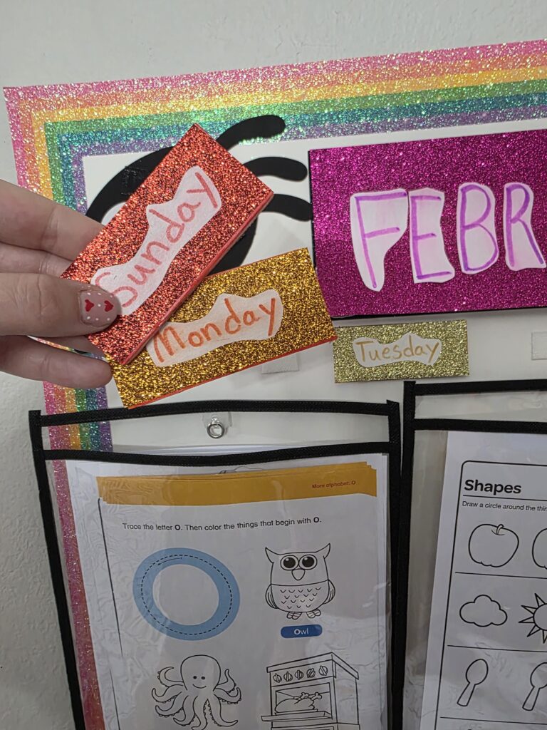 - Days and Months: Wrote them out and cut them from cardstock, then Mod Podged them onto glitter paper (because toddlers + glitter = chaos, obviously).