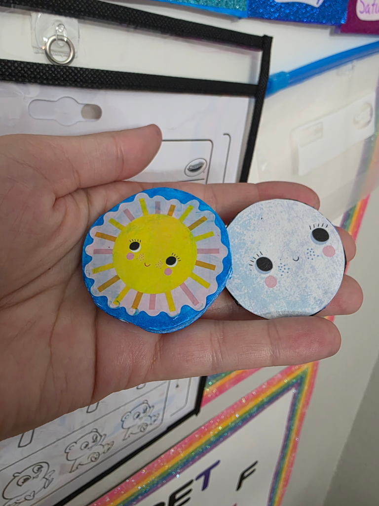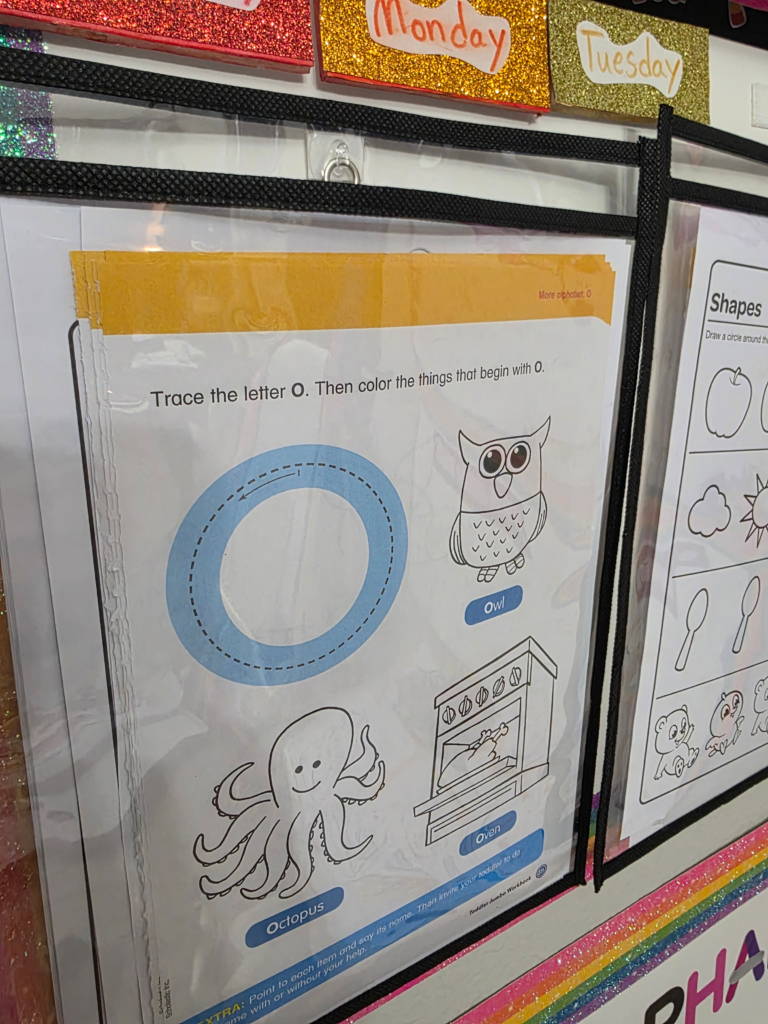 - Hooks and Plastic Holders: Each holder contains activities for the day, sometimes multiple activities.